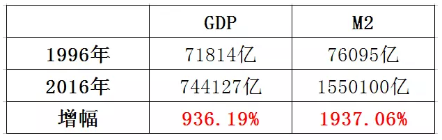 下面是1996年、2016年分别对应的GDP和M2数据表: